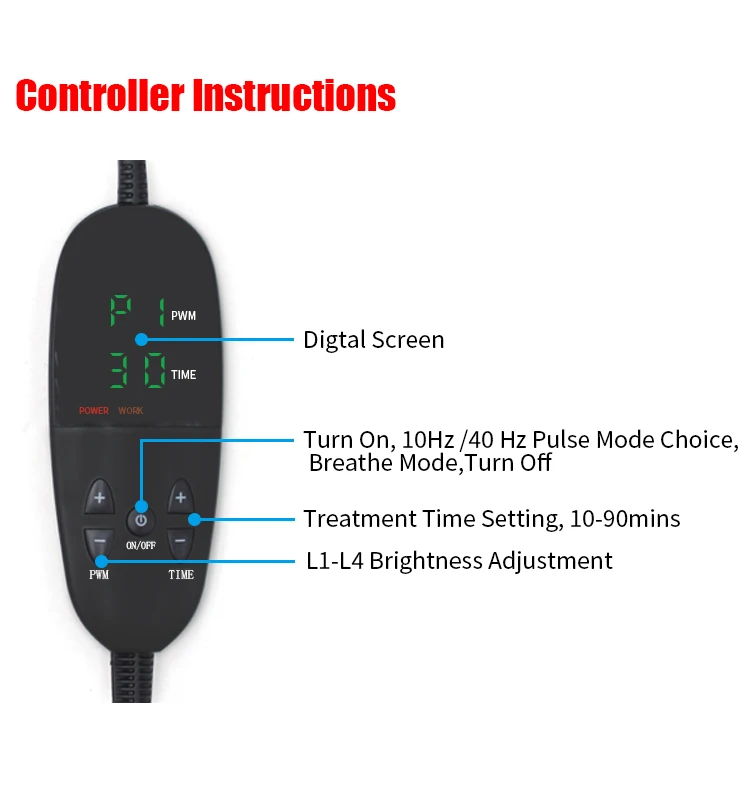 5 levels of brightness and automatic shut-off time can be adjusted via the controller to automatically shut off after 10, 20, 30, 40, 50, 60, 70, 80 or 90 minutes. You can choose the appropriate brightness and treatment time according to your personal needs and treatment area.