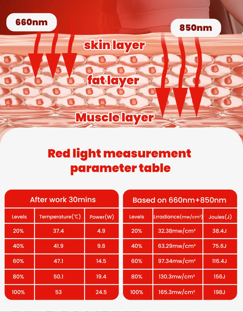 Dual wavelengths: 660 nm + 850 nm